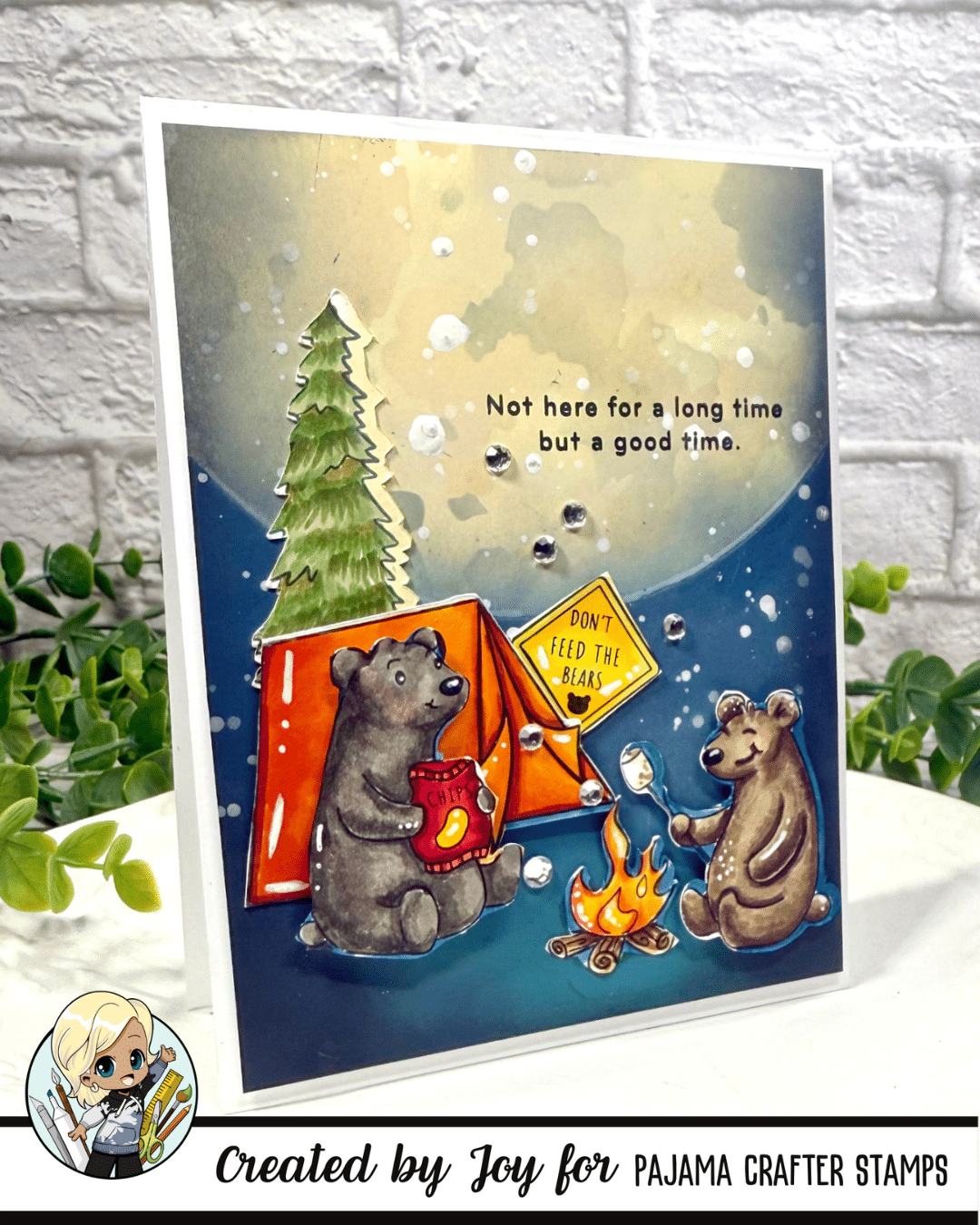 Today I’m celebrating World Card Making Day with a scene that makes me smile every time I look at it—a cozy little camping adventure taken over by bears! For some reason, whenever I imagine a campsite, I can’t help but picture the bears moving right in. They’re roasting marshmallows, making s’mores, chowing down on my favorite chips, and then curling up in my tent to gaze at the glowing full moon. It’s a whimsical twist that makes this card feel alive with story and fun.